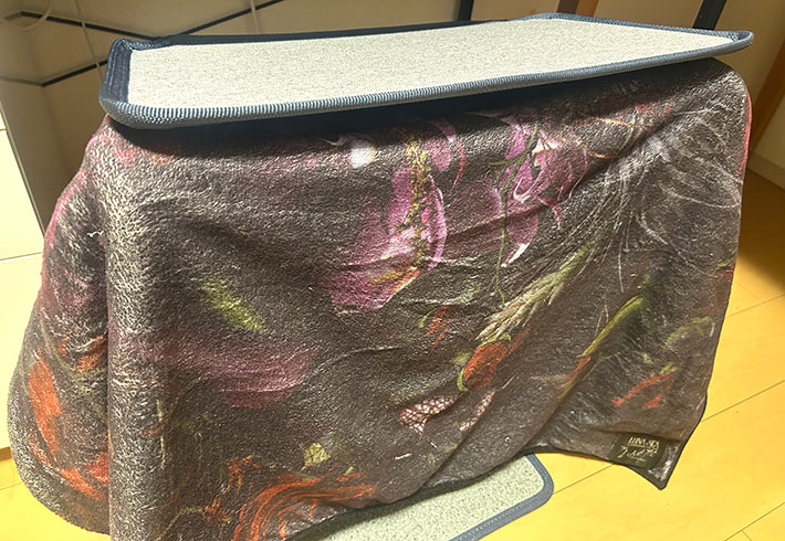 『パネルヒーター』はそのままでも十分あたたかいのですが、天板にブランケットを挟むと、ふくらはぎまですっぽりと包み込まれて、まさにこたつのような状態に。