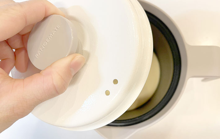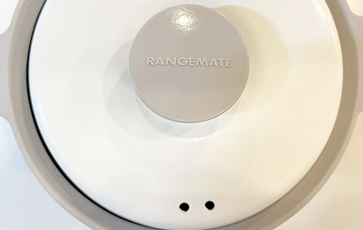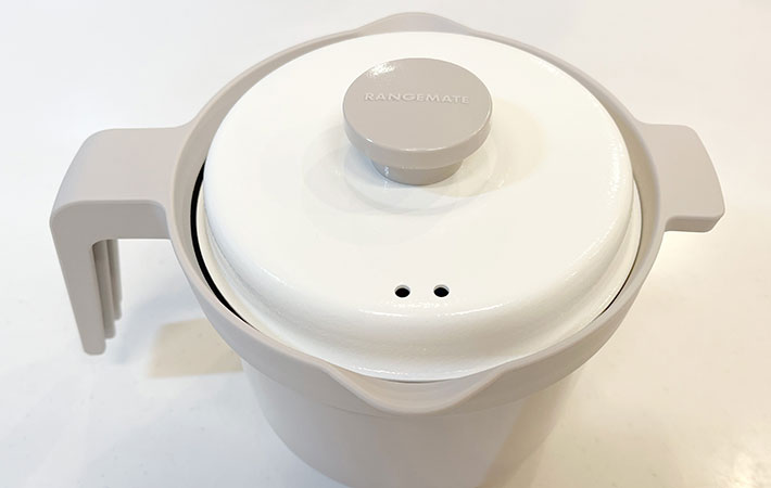 蓋の持ち手にさりげなく印字された『レンジメート』のロゴが、ちょっとしたアクセントに。