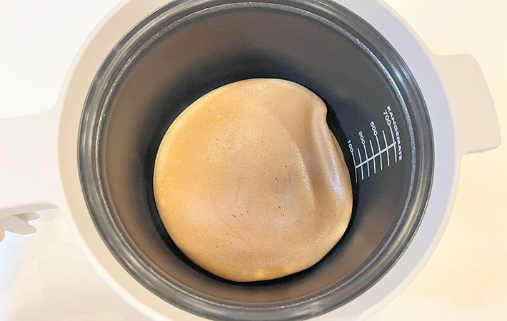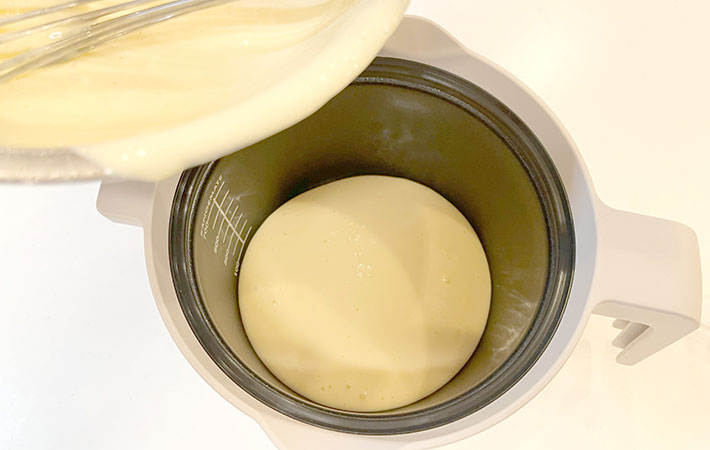本体の空焚きが終わったら、ホットケーキミックス生地を半分ほど流し入れます。