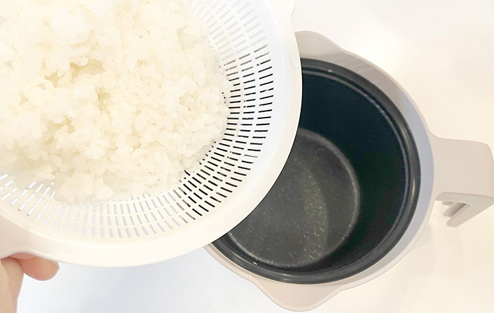 まずは1膳分程度の白米をザルに入れ、サッと水洗いし、本体に入れます。