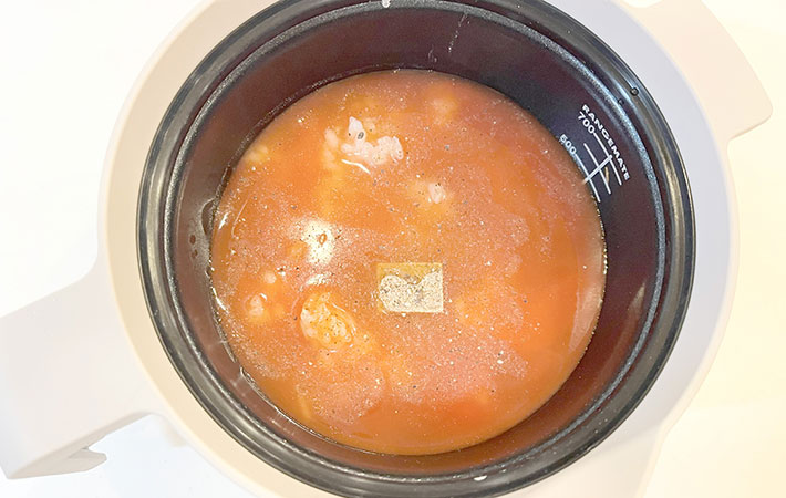 トマトジュース、水、コンソメ、塩胡椒を入れた後は、蓋をして加熱!