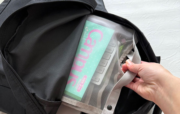 持ち物それぞれの定位置が自然に決まるので、バッグの中で迷子になることがなくなります。