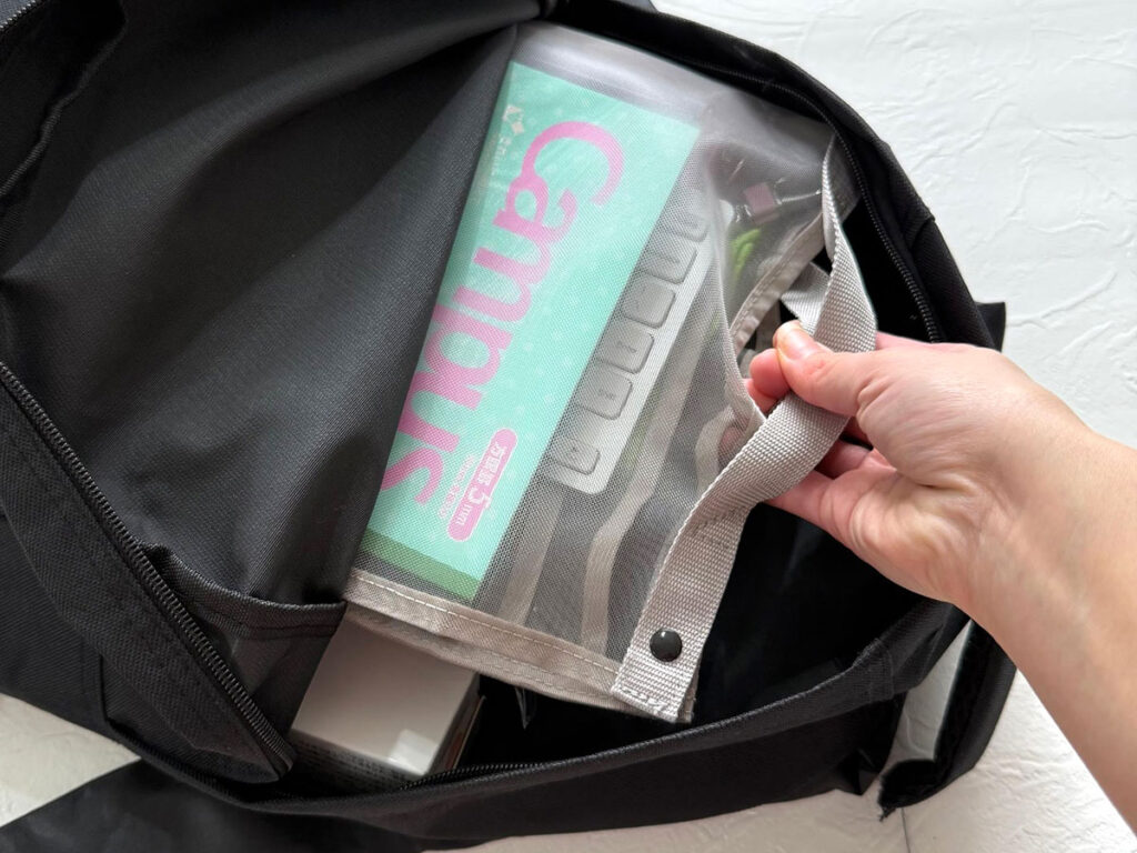 ペットボトルや折り畳み傘などを別で入れても、しっかりと区分けされて、バッグの中でごちゃつきません。