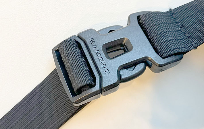 ショルダー部分のバックルもマムートのロゴ入り。