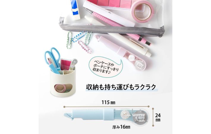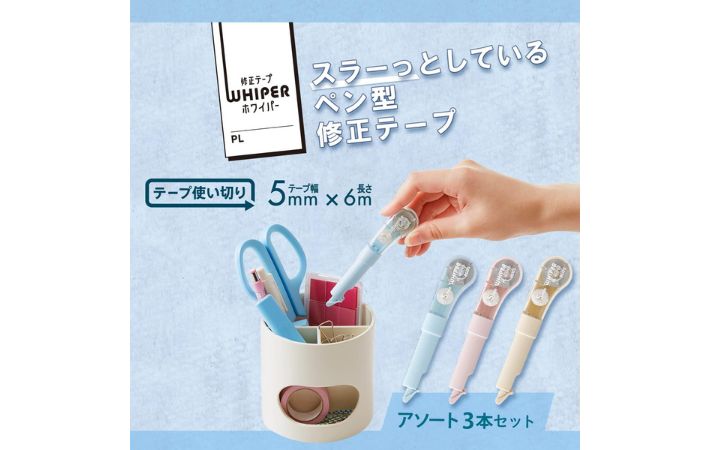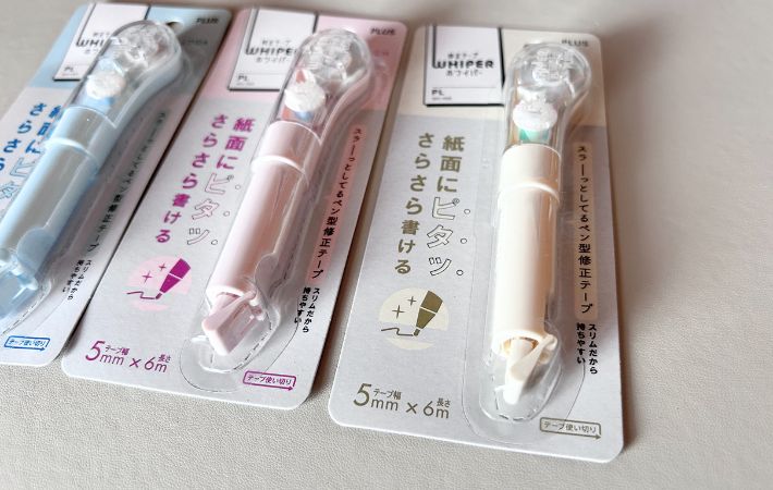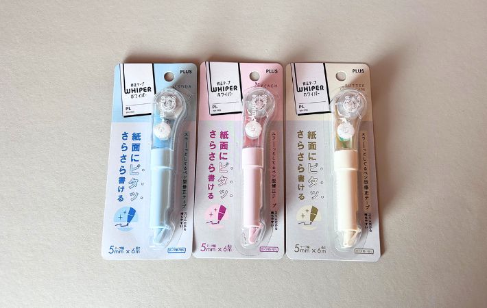 この発想、ありそうでなかった! 地味に収納がしっくりこない『修正テープ』、コレを使ってみた結果? 新着 By - shio 更新:2026-01-07 ※本記事はUPDATEが独自に制作したコンテンツです。また、本記事を経由して商品の購入が発生した場合に、ECサイト等から送客手数料を受領することがあります。 書き間違えた文字をサッと消したいだけなのに、修正テープは形状的にかさばってペン立てに入らず、収納場所に困ってしまう。 必要な時に限って手元にない、取り出すのが面倒。 そんな小さなストレスを感じていませんか。 プラスの修正テープ『ホワイパー PL』なら、ペン立てにすっきり収まるスリムなフォルムで、『修正テープだけ別に保管しないといけない問題』を解決してくれます。 Amazonで『プラス 修正テープ ホワイパー PL 5mm 3色 各1個セット』を見る 楽天市場で『プラス 修正テープ ホワイパー PL 5mm 3色 各1個セット』を見る 使いやすいだけでなく、見た目にも少しこだわりたいという場合にもぜひ手に取ってほしい1本。 スマートに収納できて目立ちすぎず、使うたび気分が整う…。 そんな便利な修正テープをご紹介します! 目次 1. プラスの修正テープ『ホワイパー PL』とは?特徴や使い心地をレビュー2. 実際に使ってみて気づいたこと2.1. 3色セットは使い分けにも便利2.2. すっきり収納3. まとめ プラスの修正テープ『ホワイパー PL』とは?特徴や使い心地をレビュー ・テープ幅:5mm ・テープの長さ:6m ・外形寸法:幅115mm×厚さ16mm×高さ24mm ・タイプ:使い切り ・数量:3個入り ・カラー:ブルー・ピンク・アイボリー(各1個) ・材質:樹脂 ペンのような使い心地とスリムなフォルム、そしてなめらかな使用感を追求したという『ホワイパー PL』。 実際に使ってみると、たしかにペンのような細さで握りやすく、グリップ付きのおかげで手元がぶれにくい印象です。 まっすぐな線で修正できるのは、『ミニローラーヘッド』と『クッションヘッド機構』というメーカー独自の構造のおかげ。 ヘッドの側面が紙面に当たりにくい設計のため、重ね引きしてもヨレにくく、テープがピタッと密着し、修正箇所がきれいに仕上がるそうです。 筆者 細かい文字の修正や、同じ場所を何度か直したい場面に最適かも! また、使い始めから最後まで動きがなめらかで、スーッと軽い引き心地が続くのも『ホワイパー PL』の魅力。 この快適さを支えているのが、転写に必要な荷重を一定に保つ独自構造『ファインキーパー』です。 引き始めはテープが浮き上がらない最適な荷重に抑え、残量が少なくなっても引き心地が急に重くならないようコントロールしてくれます。 そのため、修正テープにありがちな「途中で途切れる」「浮いてしまう」といったトラブルが起こりにくく、修正テープを使うのが苦手な人でもストレスなく使えるでしょう。 キャップがワンタッチで開き、使用中にブラブラしない点もよく工夫されていると感じました。 本体カラーは、スイーツのようなネーミングがかわいらしい『SODA(ブルー)』、『PEACH(ピンク)』、『BUTTER CREAM(アイボリー)』の3色セット。 いずれも落ち着いたくすみカラーで、大人が持っていても違和感がないデザインに仕上げられています。 筆者 ペンやノートなど、ほかの文具と色味を統一してそろえれば、さりげない一体感が生まれ、使うたびに気分が上がりそう! 実際に使ってみて気づいたこと 正直なところ、修正テープはどれも同じだと思っていました。 けれど『ホワイパー PL』を使ってみて、引き心地や仕上がりにはっきりとした違いがあるのだと実感。 まっすぐ、ヨレることなく修正できた時は、思わず「こんなにきれいに消せるんだ」と驚いてしまいました。 3色セットは使い分けにも便利 修正テープは『使う場所ごとに1本あると助かる』アイテム。 あちこち移動させなくても済むので、ブルーは仕事用に、ピンクは手帳や手紙、メモ用に、アイボリーは外出用のペンケースに入れる用として使っています。 すっきり収納 ペンのようなスリムなフォルムなので、コンパクトなペンケースに入れても違和感がなく、見た目もすっきり。 修正テープだけ別に保管しなければならない、というありがちな悩みも解消してくれます。 くすみカラーの3色が並ぶと、主張しすぎないのにどこか統一感があり、デスク全体が自然と整って見えるのも嬉しい気づきポイントです。 まとめ ペンのように握りやすいスリムなフォルムと、最後まで安定したなめらかな引き心地が魅力の『ホワイパー PL』。 修正テープにあるあるなプチストレスを、解消してくれる1本でした。 かわいらしくも大人向けのデザインも素敵ですよね。 とっても使いやすいので、お子さん用や買い替えにもおすすめです。 Amazonで『プラス 修正テープ ホワイパー PL 5mm 3色 各1個セット』を見る 楽天市場で『プラス 修正テープ ホワイパー PL 5mm 3色 各1個セット』を見る [文・構成/UPDATE編集部] 出典 Amazon/楽天市場 関連ワード 文房具検証 この記
