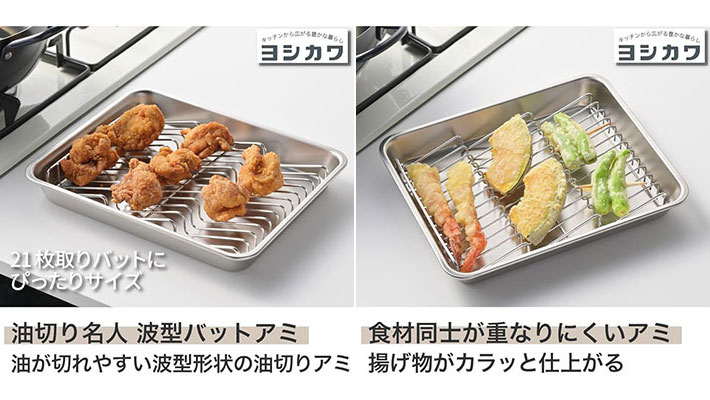 いつもの揚げ物料理をワンランクアップしてくれる、ヨシカワの『油切り名人 波型バットアミ』。気になった人は試してみてくださいね。
