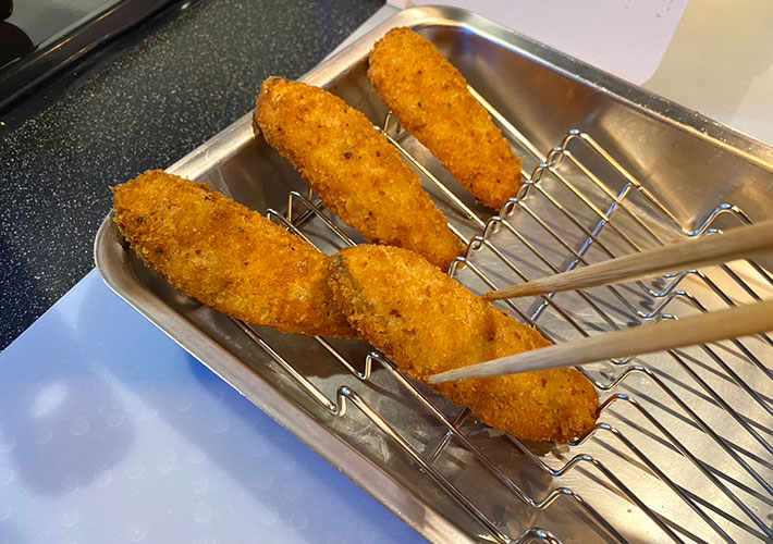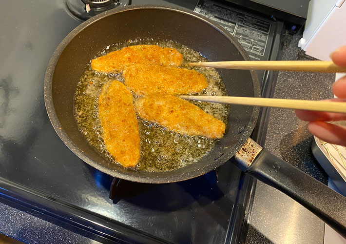 子供たちの大好物である鮭のフライを揚げ、『油切り名人 波型バットアミ』に乗せてみます。