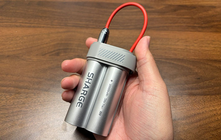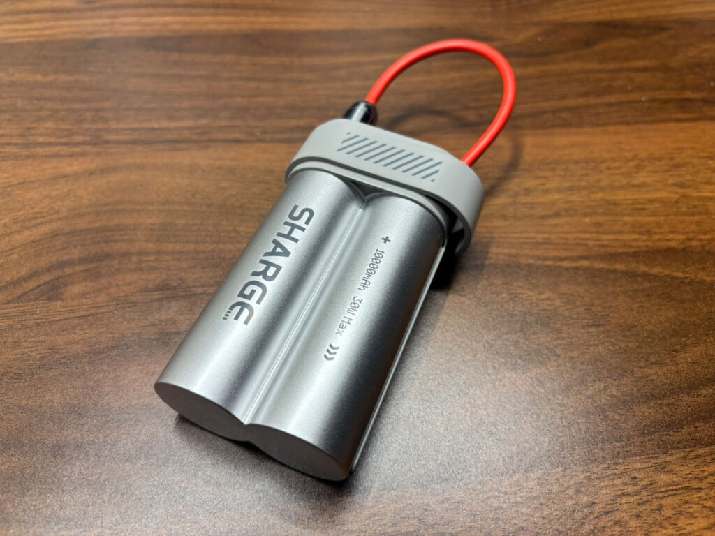 『SHARGE Pouch Mini』のデザインは、商品ページで見た印象そのまま。いかにもバッテリーっぽい独特なフォルムで存在感があります。