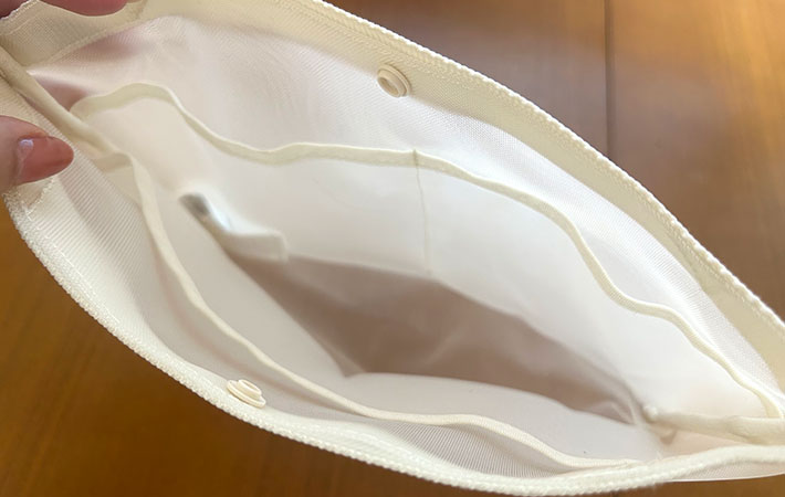 上部のスナップを留めるとバッグインバッグの口がすっきりと閉じるので、ほかのものがうっかり入ってしまったり、中身が飛び出してしまったりすることもなさそうです。