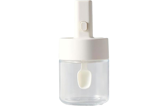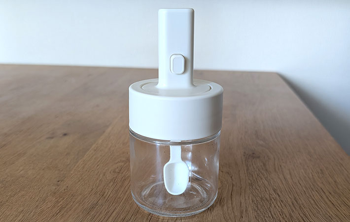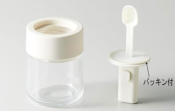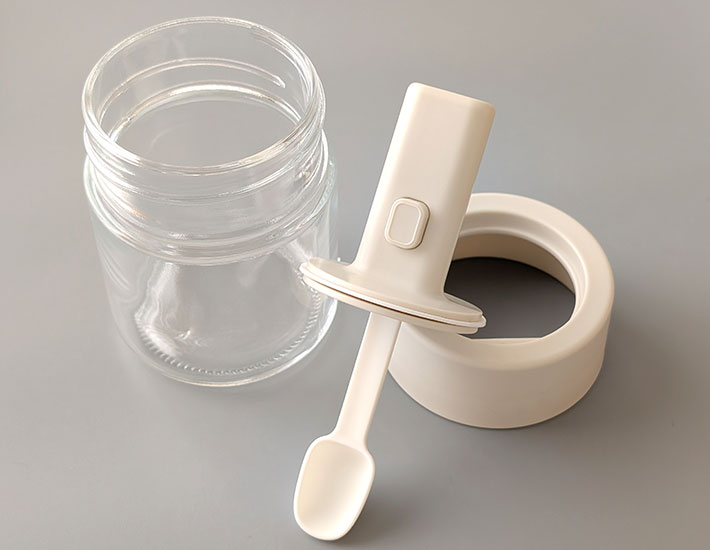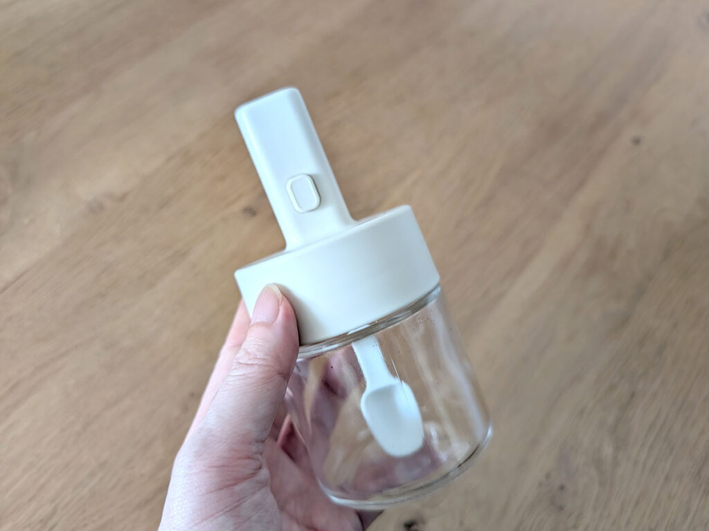 一見すると、シンプルなガラス製の保存容器ですが、最大の特徴は蓋と一体化したスプーン。ボタン1つでスプーンの長さが調整できます。
