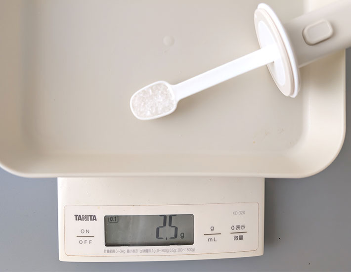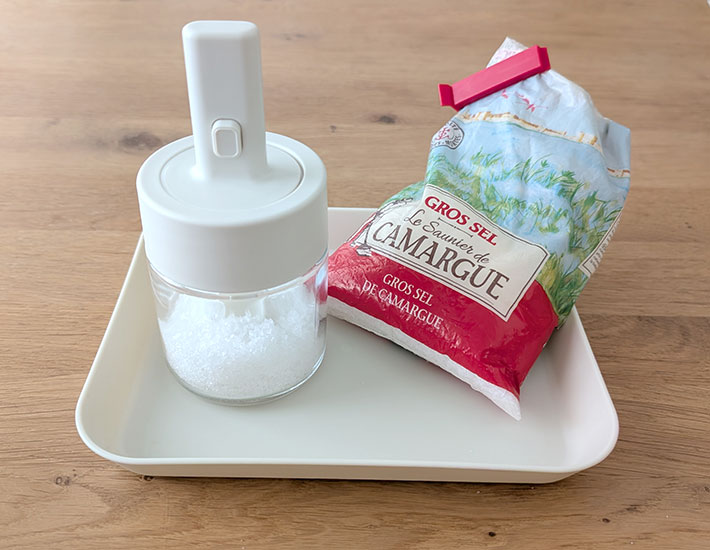 愛用しているカマルグの塩『 フルール・ド・セル』で試したところ、すり切り1杯で約2.5gでした。