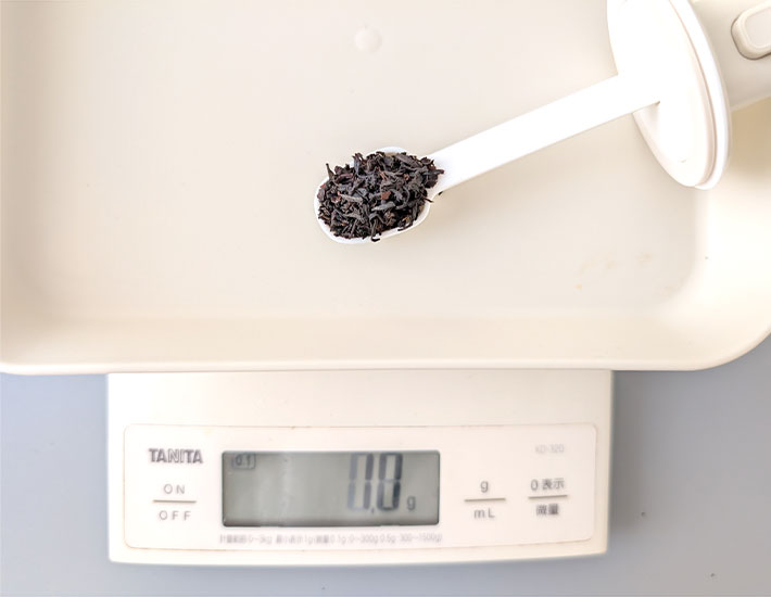 普段飲んでいる紅茶の茶葉の場合、スプーン山盛り1杯で約1gでした。