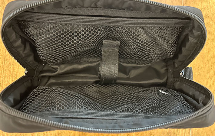 中には左右にメッシュポケットがあり、中央には面ファスナーつきのベルトが配置されています。ここでケーブル類をまとめることができそうです。