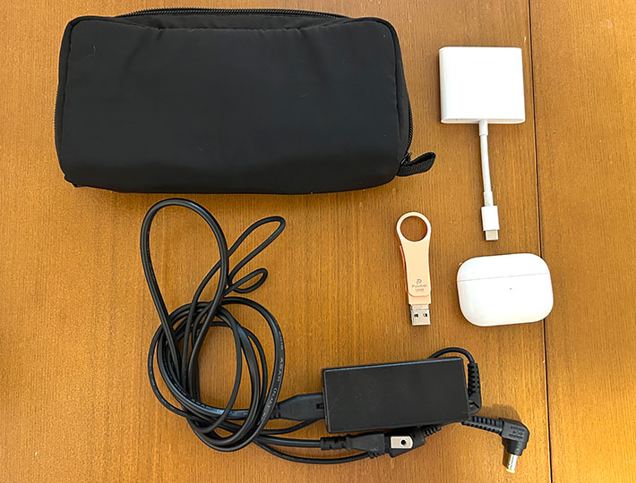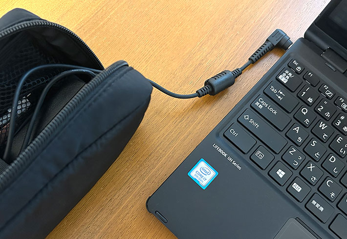 電源アダプタをポーチに入れたまま使えるのも便利でした。