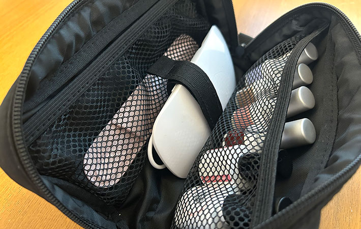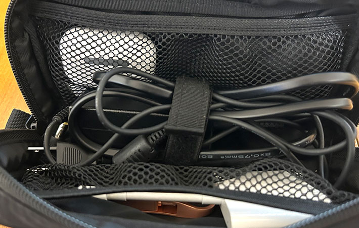 電源アダプタはケーブルとまとめて中央に固定し、それ以外のアイテムは左右のポケットに収納できました。