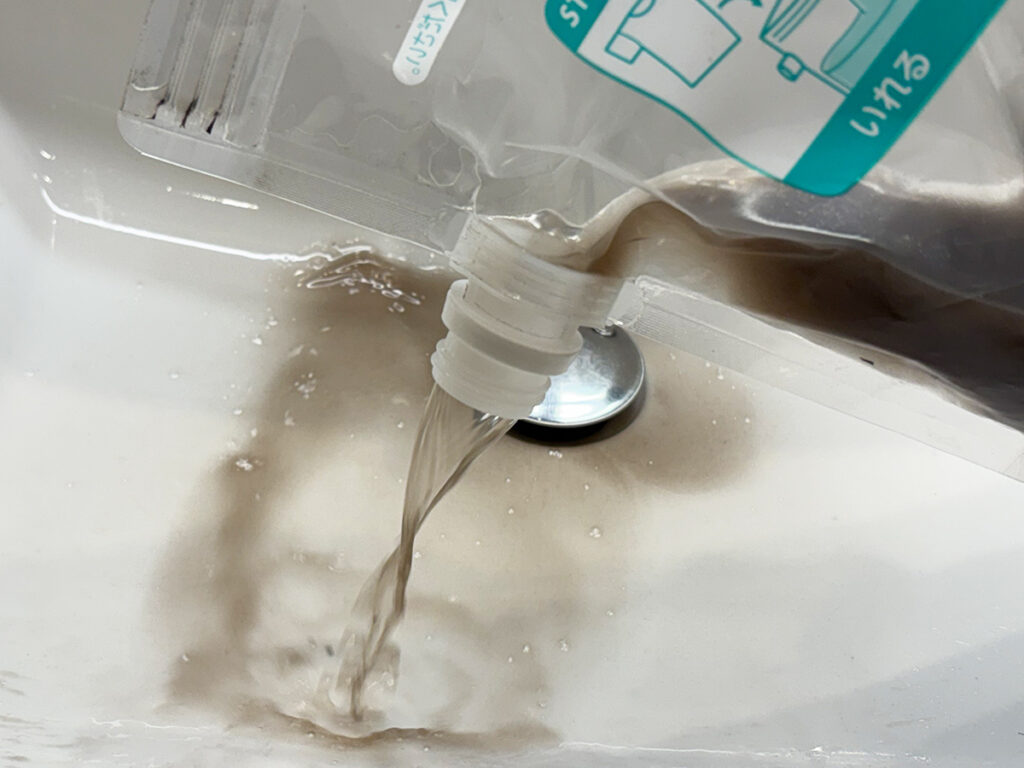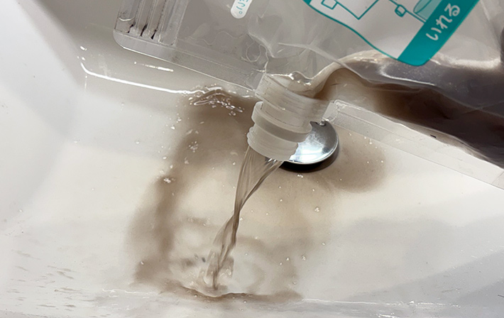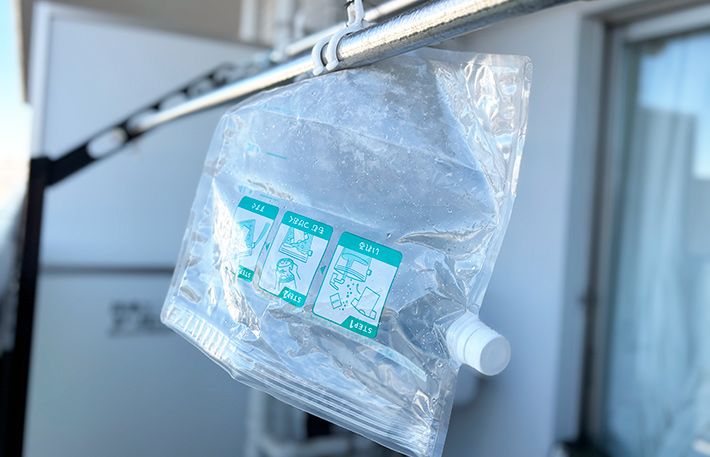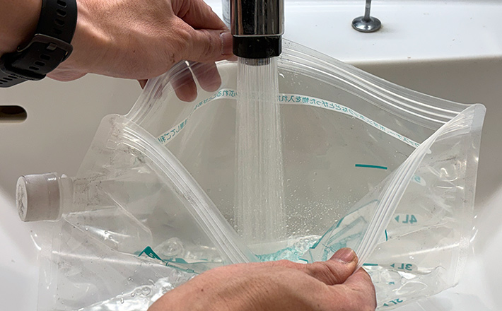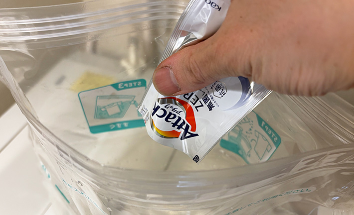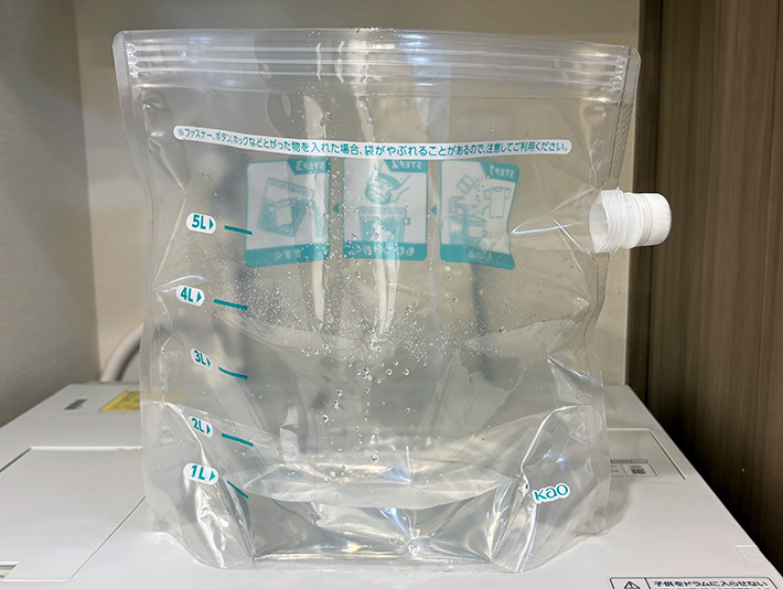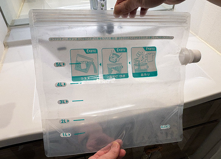 まずは、袋に水と洗剤を入れてください。