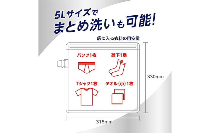5ℓサイズの『袋でどこでもお洗たく』は、靴下だけでなく複数の衣類をまとめ洗いするのにも便利です。