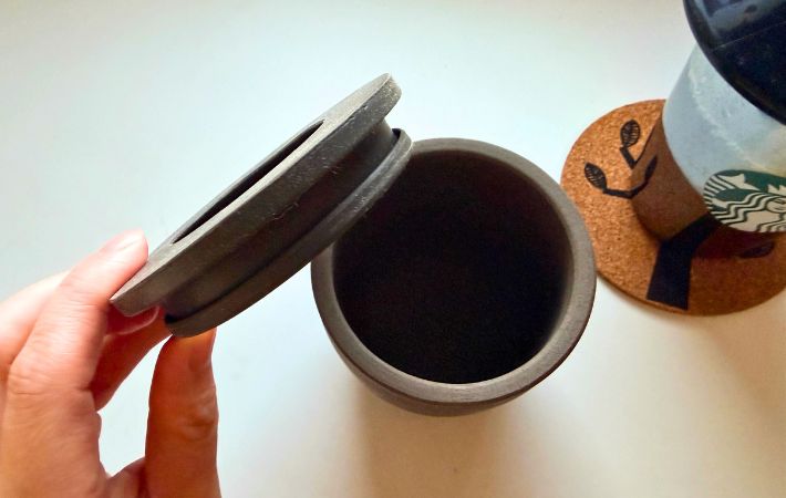 本体は陶磁器製で、コーヒーかすが乾きやすいよう、あえて釉薬を使わない焼き締め製法が採用されています。耐熱温度は200℃。