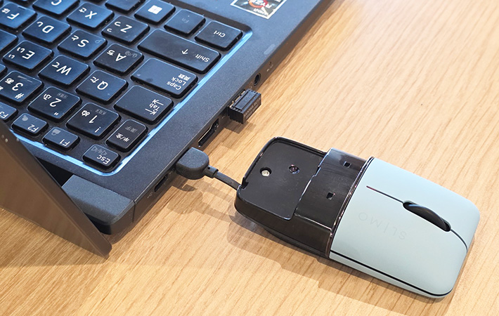 『SLIMO』の大きな特徴は、USBレシーバーと充電用ケーブルが本体に内蔵されている点です。