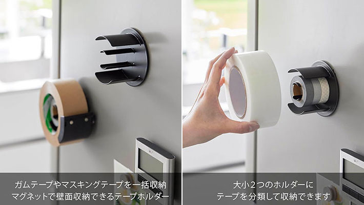 山崎実業『tower』シリーズの『マグネットテープホルダー』は、ガムテープや養生テープ、マスキングテープなど、大小さまざまなテープ類をマグネットで浮かせて収納できるお助けアイテム。