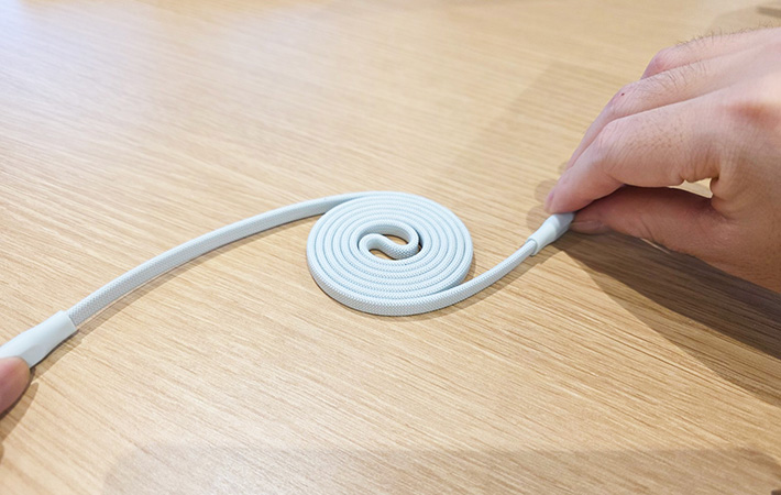 ケーブル内部に磁石が組み込まれていて、渦巻き状にきれいにまとまる仕組みは以前紹介したケーブルと同じ。