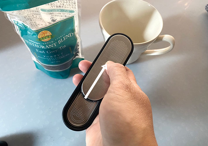 ストレーナーを指で軽くスライドするだけで片面が開くので、そのまま好きな茶葉をすくって閉めれば準備完了です。