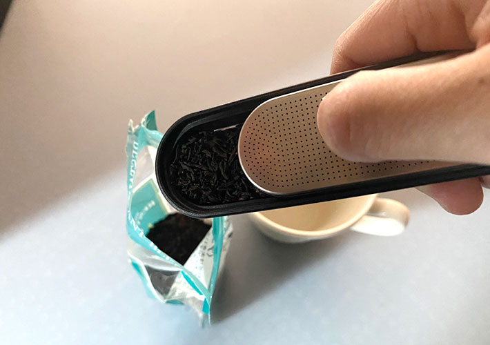 指でスライドすると中が開き、一杯分の茶葉をすくうことができる点が最大の特徴で、これ1つでティースプーンの役割もこなしてくれます。