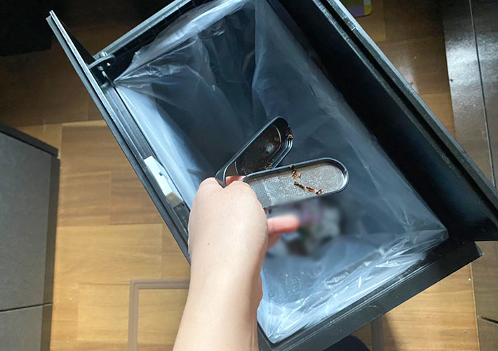 勢いよく開けると茶殻が飛び散りやすいので、ゴミ箱の上で開けるほうがよさそうです。