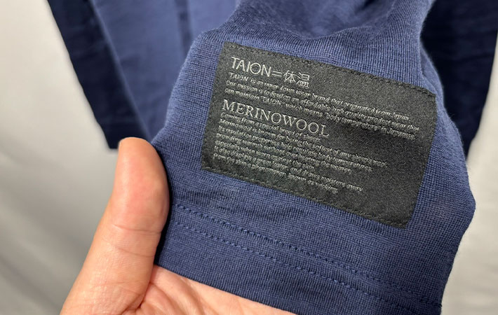 そんなTAIONが販売している『メリノウール アンダーウェア ロングスリーブ Tシャツ』は商品名にもある通り、肌触りのいいメリノウールを使用しています。