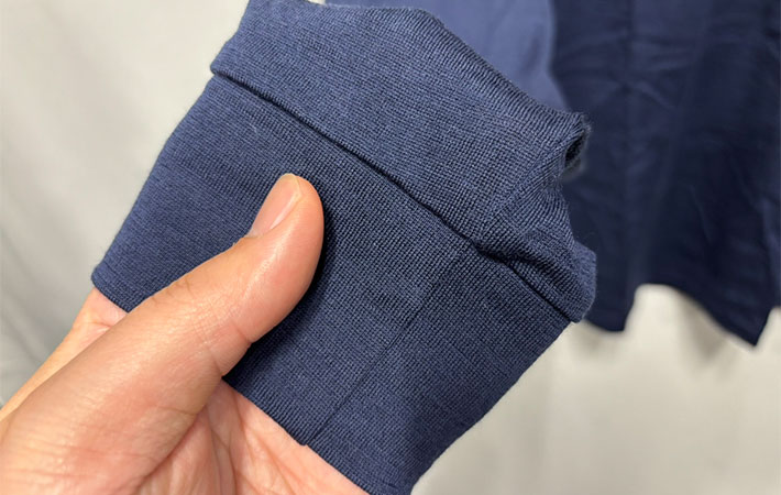 次に注目したのが襟と袖口。どちらも伸縮性のあるリブ仕様になっていて、身体へのフィット感が高まるようになっています。