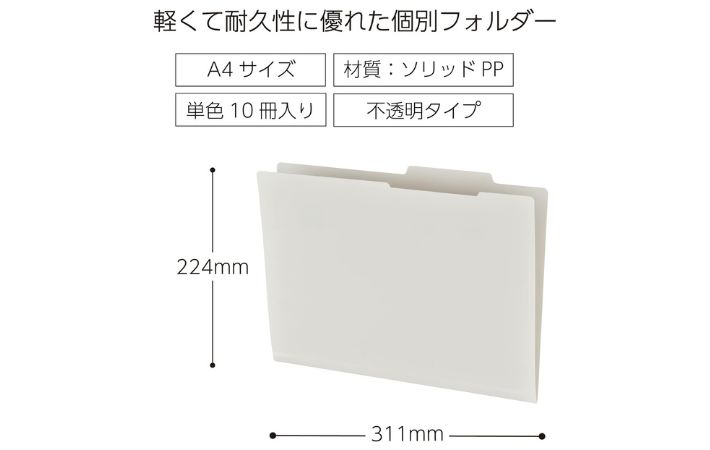「こんなにピッタリなことある?」 無印『ファイルボックス』と相性抜群なのが、コクヨの… 新着 By - shio 更新:2026-01-29 ※本記事はUPDATEが独自に制作したコンテンツです。また、本記事を経由して商品の購入が発生した場合に、ECサイト等から送客手数料を受領することがあります。 見た目はシンプルだけど、毎日の書類整理を革命的に変えてくれる。 そんなフォルダーが文具メーカーの『コクヨ』から登場しています。 Amazonで『コクヨ(KOKUYO) 個別フォルダー PP製 A4 10冊セット 不透明グレー AMA4-IFP-10M』を見る 楽天市場で『コクヨ(KOKUYO) 個別フォルダー PP製 A4 10冊セット 不透明グレー AMA4-IFP-10M』を見る ただのフォルダーだと思っていましたが、「こんなふうになっていて欲しかった!」と思う細かな工夫がたくさん。 このフォルダーを使い始めてからというもの、『書類探しの時間』がぐっと減り、デスクの上が見違えるほどスッキリしました…。 「揃うって気持ちいい」コクヨの『個別フォルダー』をレビュー ・寸法:幅311mmx高さ224(+10)mm ※()内は山高さ ・サイズ:A4 【入り数】 10冊 ・製品色:不透明グレー ・材質:PP 特徴①コンパクトなシンプル設計 コクヨの個別フォルダーの大きな特徴が、一般的な個別フォルダーより高さを約2cm抑えたコンパクト設計です。 小さくて大丈夫?と心配してしまうかもしれませんが、A4サイズの書類がはみ出すことはありません。 むしろ、この絶妙なコンパクトさこそがポイント。 高さがあまりないファイルボックスに入れた時に見出し部分が飛び出さず、全体がきれいに揃うため、スッキリ収納したいという願いを叶えてくれます。 筆者 高さ240mm以上のファイルボックスまでならはみ出さずに収納できます! 無印のファイルボックスに入れてみた 試しに、無印良品の『再生ポリプロピレン入り ファイルボックス・スタンダードタイプ(幅10cm)』に収納してみると…。 無印良品 再生ポリプロピレン入りファイルボックス・スタンダードタイプ・ホワイトグレー 約幅10×奥行32×高さ24cm 83904364 Amazonで『無印良品 再生ポリプロピレン入りファイルボックス・スタンダードタイプ・ホワイトグレー 約幅10×奥行32×高さ24cm 83904364』を見る 楽天市場で『無印良品 再生ポリプロピレン入りファイルボックス・スタンダードタイプ・ホワイトグレー 約幅10×奥行32×高さ24cm 83904364』を見る 見出し部分がはみ出すことなく、高さもぴったり。 中で浮いたり引っかかったりすることもなく、すっと収まります。 一般的な個別フォルダーだと、どうしても上が飛び出してしまいがちですが、このフォルダーならファイルボックスの中が一直線に揃うのがグッド! 見た目が整うだけでなく、出し入れもしやすく、「無印のファイルボックスと一緒に使う前提で作られているのでは?」と思うほどの相性のよさでした。 特徴②軽くて丈夫な素材と質感 素材は、軽さと耐久性を兼ね備えたソリッドPP製。 シートの厚みは約0.4mmでとても薄く軽いですが、耐久性はしっかりあります。 筆者 従来のコクヨ『発泡PP』タイプの個別フォルダーとは素材の厚みや感触がやや違うため、購入時に注意してくださいね。 さらに、水をはじくのも嬉しいポイント。うっかり水滴がついたり、飲み物をこぼしてしまったりしても、サッと拭き取るだけで解決します。 紙製フォルダーのように「濡れてヨレる」「シミになる」といった心配が少なく、書類管理のハードルを下げてくれるでしょう。 また、きれいな見た目を保ちやすく、長く使えるフォルダーを探している人には特に向いていると感じます。 特徴③2タイプ用意 こちらの個別フォルダーは、用途に合わせて2種類から選べるのも特徴です。 筆者が購入したのは、中身を隠しつつ見た目をすっきり整えたい人におすすめな不透明タイプ。 中の書類がうっすら見えますが、プライバシー保護効果は抜群です。 内容をすぐに確認したい人向けの半透明タイプもあります。 コクヨ(KOKUYO) 個別フォルダー PP製 A4 10冊セット 半透明クリア AMA4-IFP-10T Amazonで『コクヨ(KOKUYO) 個別フォルダー PP製 A4 10冊セット 半透明クリア AMA4-IFP-10T』を見る 楽天市場で『コクヨ(KOKUYO) 個別フォルダー PP製 A4 10冊セット 半透明クリア AMA4-IFP-10T』を見る 整理の仕方や置き場所に合わせて選べるのはいいですよね。 また、別売りのファスナーを組み合わせれば書類をしっかり綴じて管理することが可能。 インデックスシールがついているので書類の分類に活用できます。 まとめ コクヨの個別フォルダーは、コンパクトさと軽さ、丈夫さが揃った完成度の高いアイテムでした。 従来品より高さを約2cm抑えた設計により、愛用している無印良品のファイルボックスと相性抜群。 見出しがはみ出さずぴったり収まるのが1番買ってよかったと思ったポイントです。 薄いのに丈夫で少々の汚れや水濡れにも強いのも気に入っている点。 今回は不透明タイプを選びましたが、半透明タイプも欲しくなっちゃいました。 「書類がきれ