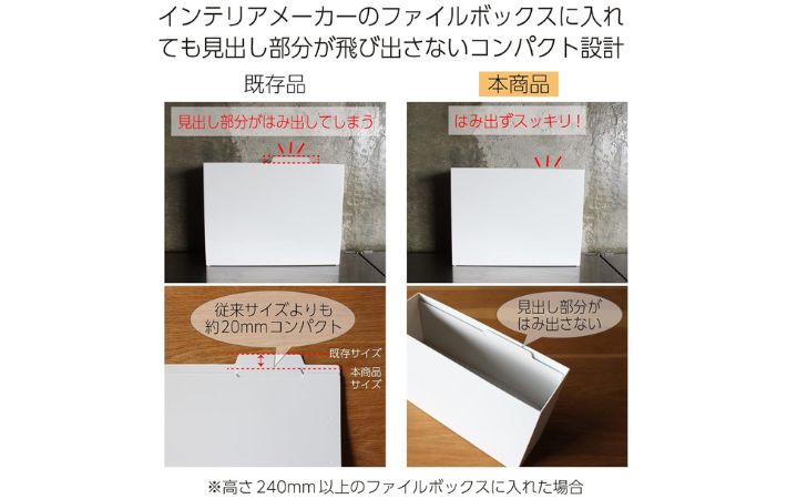 高さがあまりないファイルボックスに入れた時に見出し部分が飛び出さず、全体がきれいに揃うため、スッキリ収納したいという願いを叶えてくれます。