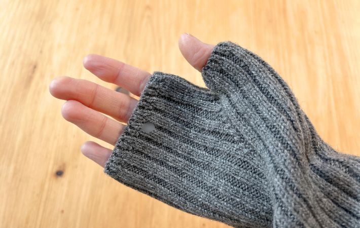 指先が出るデザインのおかげで、PC作業や細かな作業も着けたまま快適にこなせます。