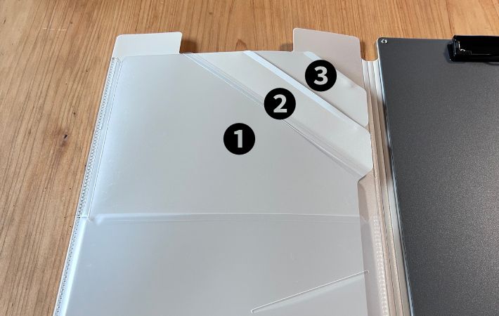 そんなクリップホルダーの1番の特長は、中に3段のインデックスポケット構造がデザインされていること。