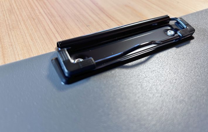 上部にあるクリップも頑丈ですが、軽い力で開閉できます。約40枚の書類をしっかり挟むことができますよ。