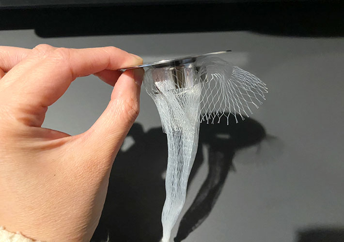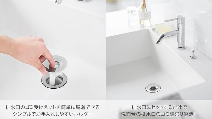 市販のゴミ受けネットを取りつけて、洗面台の排水口に設置できるホルダーです。