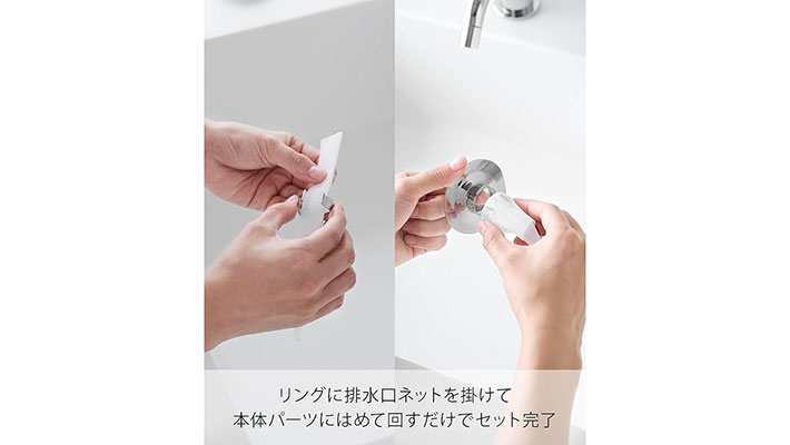 リングの方に排水口ネットを掛けたら、本体パーツにはめて回すだけでロックされます。これでネットが外れて落下するのを防ぐという仕組み。