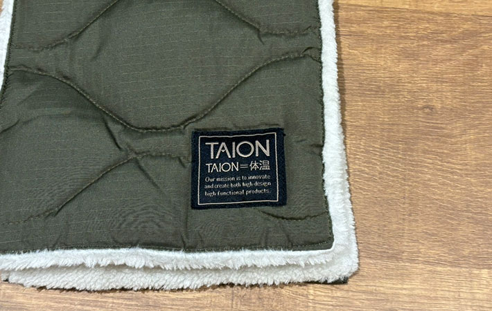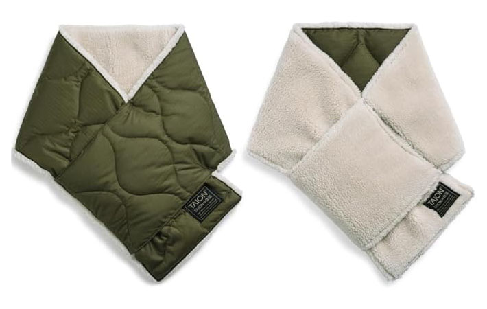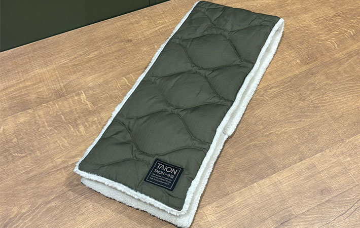 シンプルなアイテムなだけに使用した時の快適さが際立つ、TAIONの『ミリタリー リバーシブル ダウンマフラー』。