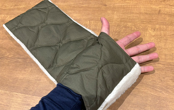 リップストップ生地で作ったキルティングと、モコモコなボア素材からなるマフラーで、中には保温性に優れたダウンが入っています。