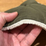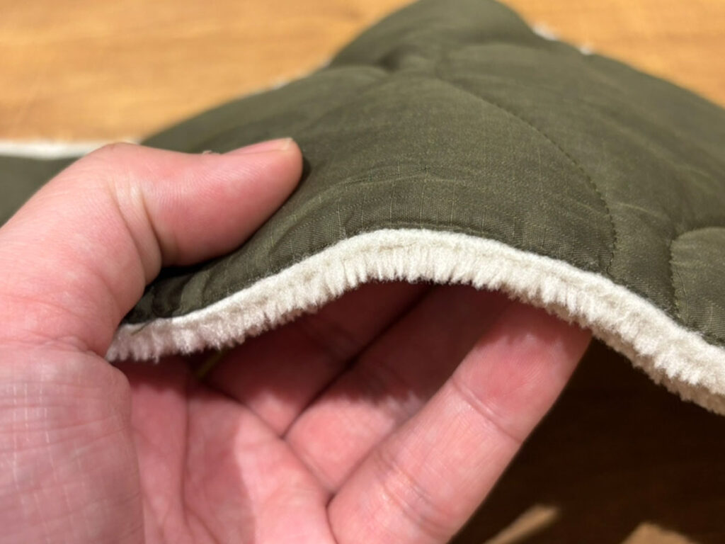 筆者はダークオリーブとクリームのカラーを選択。ボア素材を触ってみるとしっかりとした厚みがあり、いかにもあたたかそうな印象です。