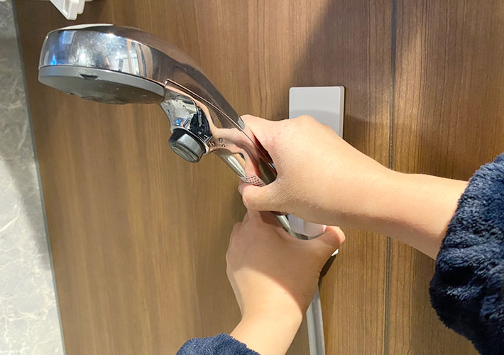 シャワーヘッドをしっかりホルダーに差し込んで、ぐっと力を入れながらヘッドをゆっくり前に傾けると、カチッカチッと段階的に角度が変えられます。