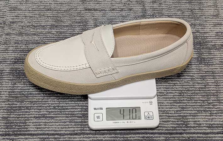 アウトソールはラバー製のため重量は少し重め。27cmサイズで410gあります。