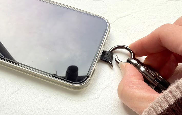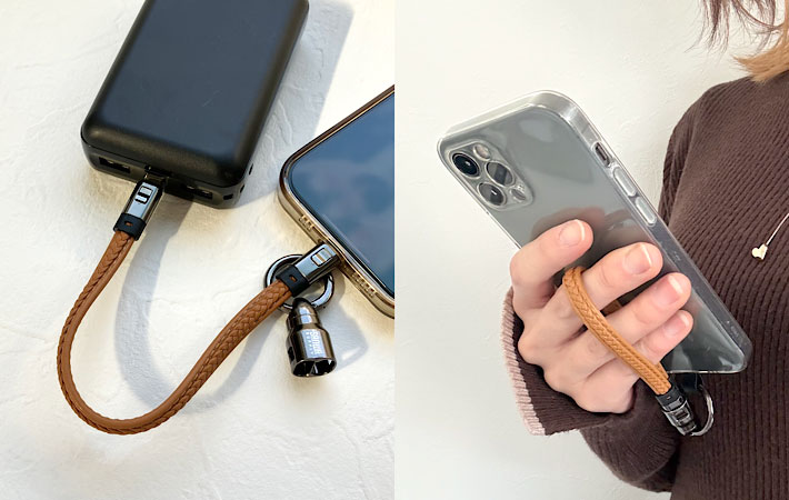 普段はスマホケースに取りつけてストラップとして使い、充電が必要な時だけサッと外してケーブルとして使えます。