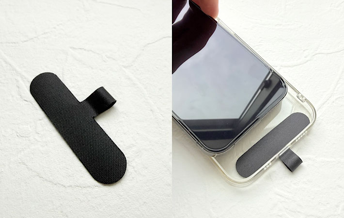 まず、付属のストラップホルダーをスマホケースに挟みます。