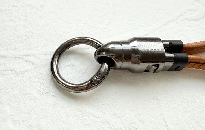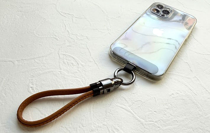 一見するとおしゃれなレザー調のスマホストラップですが、実はこれ、そのまま充電ケーブルとして使えるというユニークなアイテムなんです。