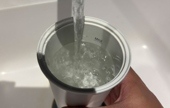 使い方はとても簡単。本体上部の蓋を外し、カップ内側に書かれた『MAX』というところまで水を注ぎます。