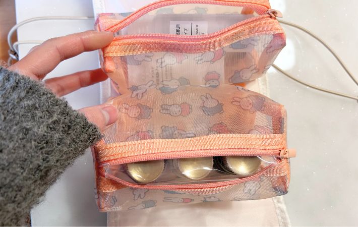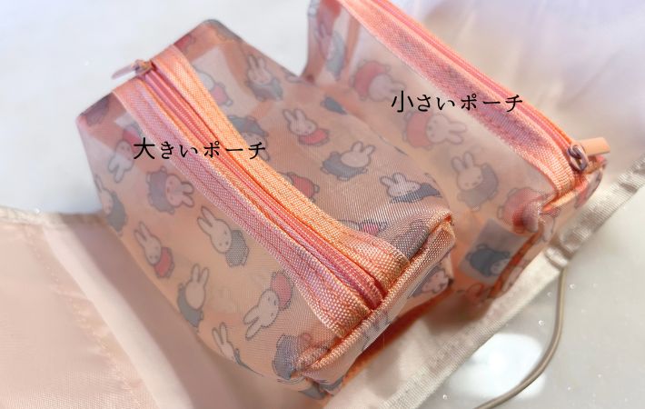 ポーチを広げると、サイズ違いのメッシュポーチが2つ配置されていて、ひと目で中身を確認できる仕様になっています。