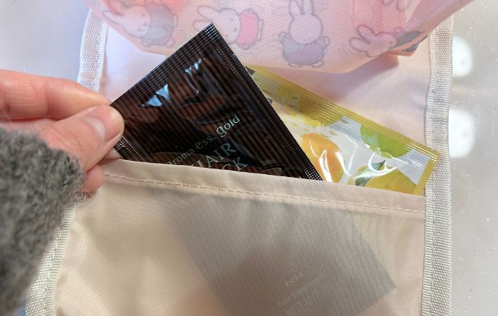 内側にはポケットが1つついていて、コットンや綿棒などの細かいアイテムを分けて収納できるのもポイントです。