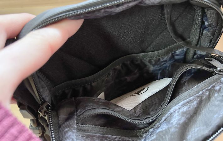 スリットポケット側はフリースのような素材で、スマホやタブレットを安全に収納できそう!