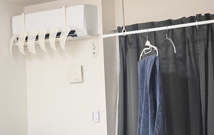 さらに、この風よけカバーのおかげで、エアコンの風を真横の洗濯物の方向へ向けられるようになり、部屋干しした衣類の乾きも明らかにスピードアップしました。